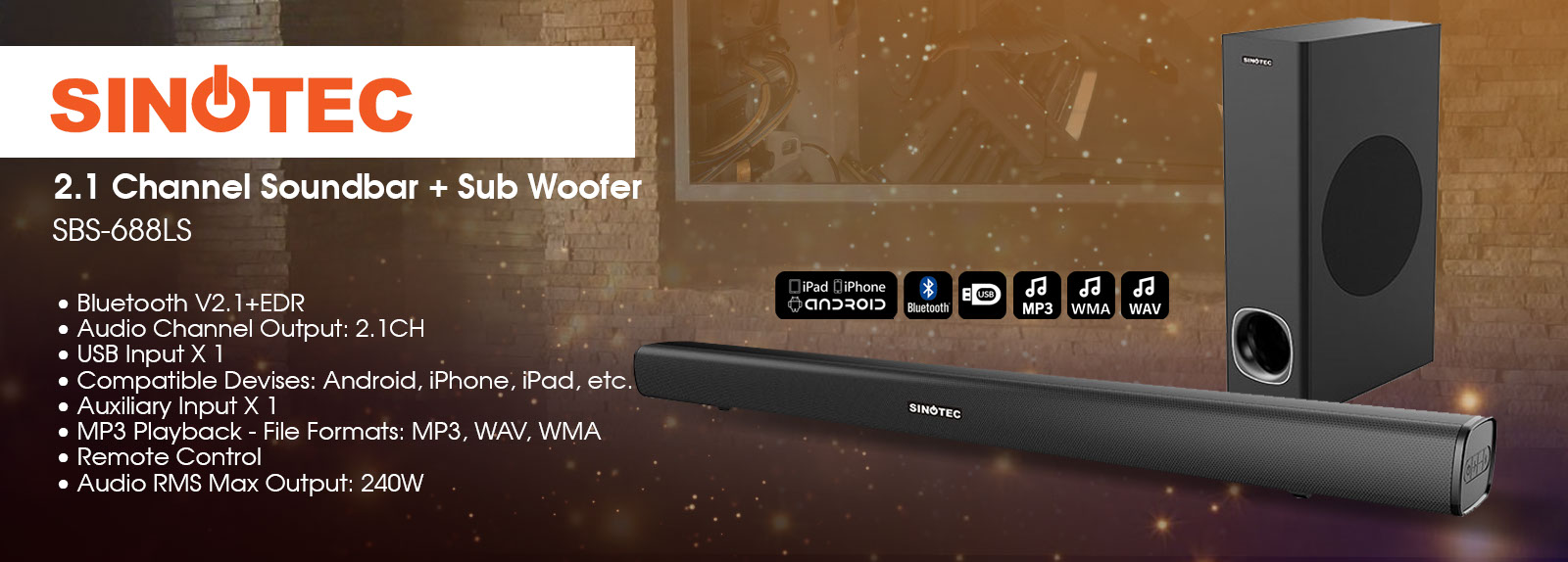 Powerful music wirelessly! Stream music wirelessly over Bluetooth® from any smart device. A dual amplifier offers better sound quality and 230W RMS total output power gives music a solid punch